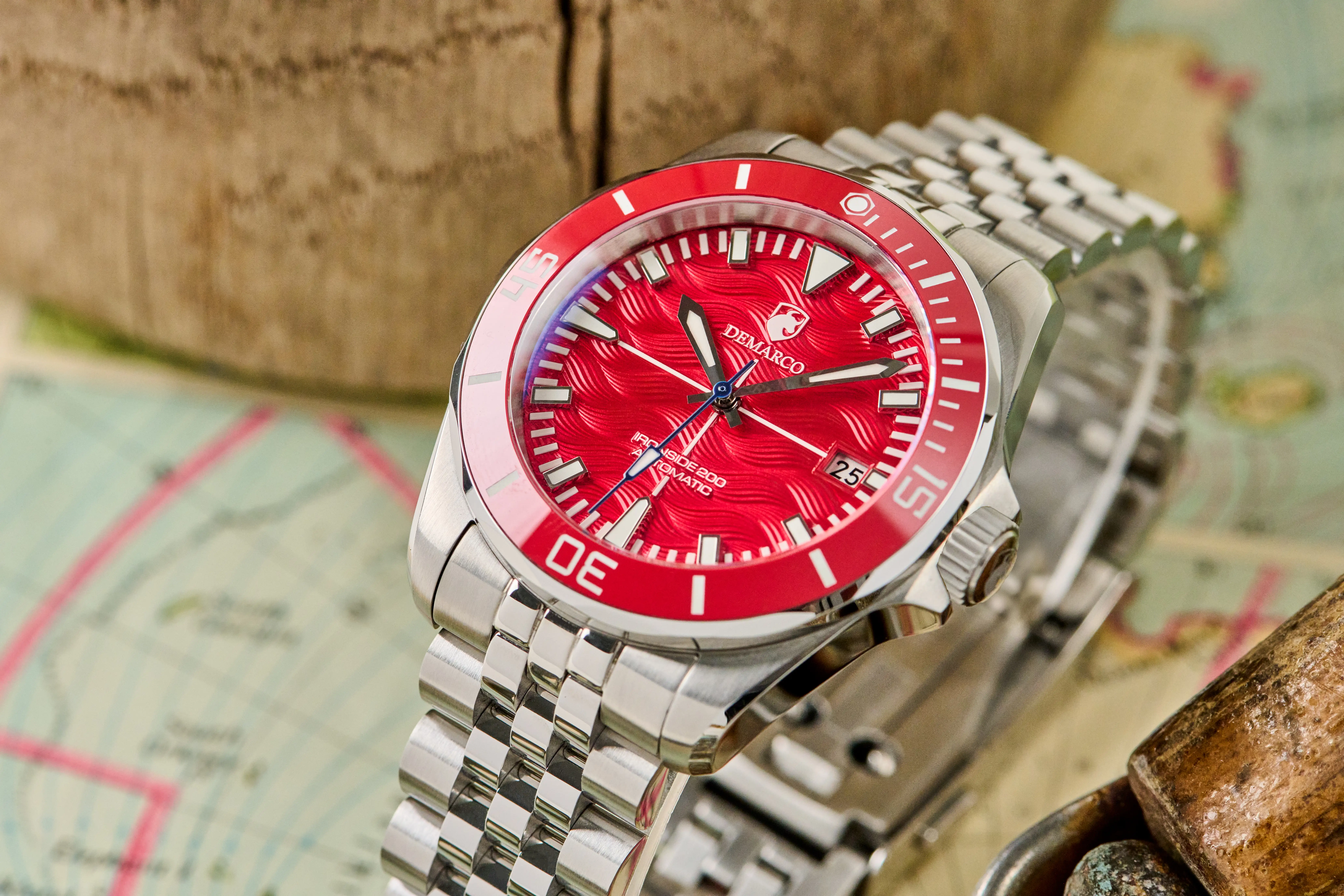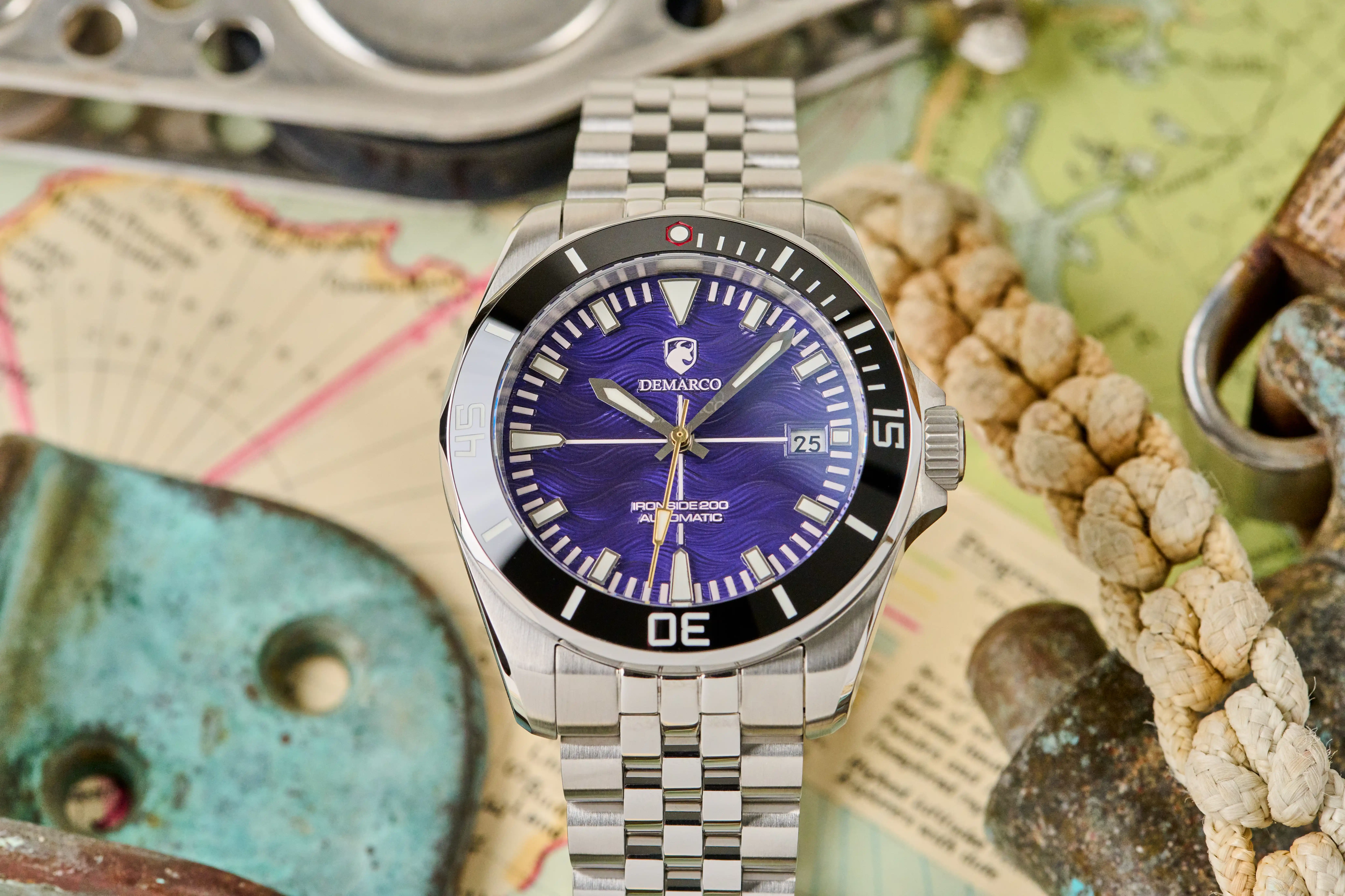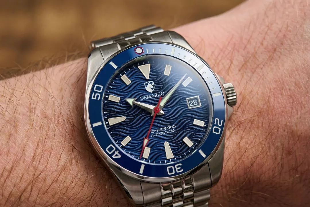 The DeMarco Ironside 200 is a beautiful wave-dial automatic diver designed in Boston. Taking influence from Italian style and classic watch design, it balances luxury, durability, and everyday versatility. Crafted with a 316L stainless steel case, a scratch-resistant ceramic bezel, and a slim Miyota 9015 automatic movement, it is a dream to wear on the wrist.